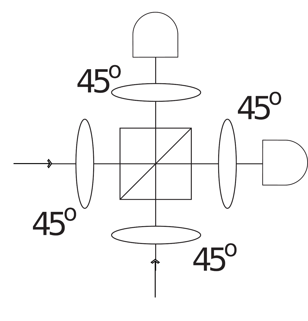 A single beam splitter can also be seen as a gate acting on two photons. When two identical photons simultaneously impinge on a symmetric beam splitter from two different input ports, they undergo a purely quantum phenomenon called Hong-Ou-Mandel (HOM) interference. It means that the two photons never leave the beam splitter separately: either they both leave via one of both via the other output port.